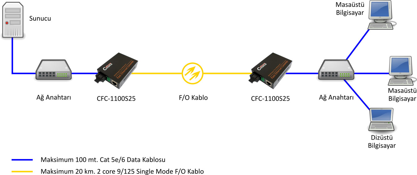 Cifocs CFC-1100S25, 10/100M Single Mode fiber optik ethernet dönüştürücü, 100Base-Fx single mode fiber optik ağlar ile 10/100Base-Tx bakır ağlar arasında geçişler için kullanılır.