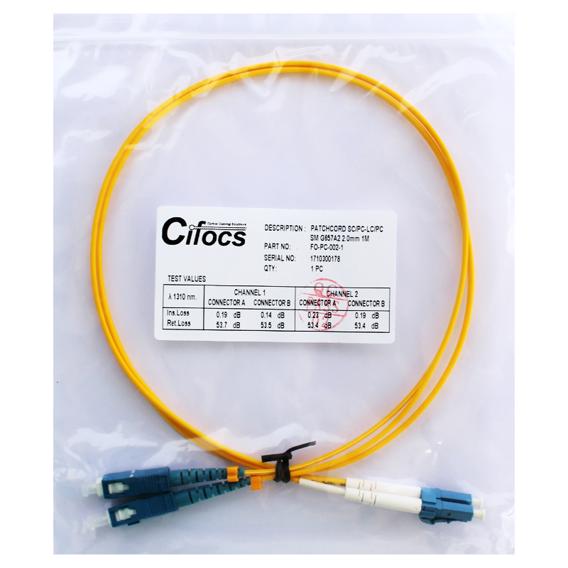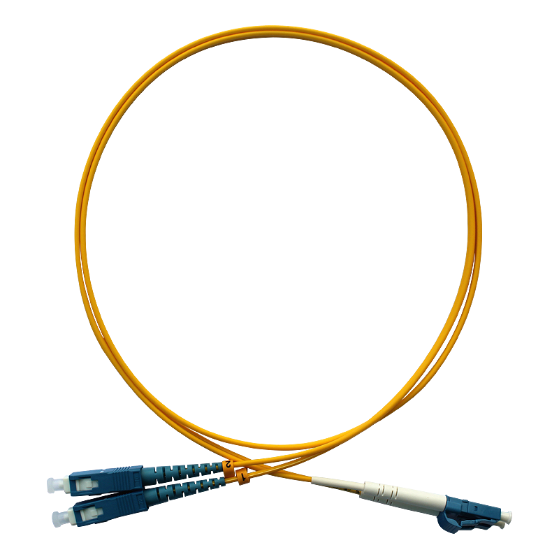 SC/PC-LC/PC Duplex 9/12µ Single Mode Fiber Optik Patch Kablo, bir tarafı SC/PC, diğer tarafı LC/PC konnektörlü, çift 9/125µ single mode fiber özlü (core), 2 mm dış kılıfa sahip fiber optik ara bağlantı kablosudur.