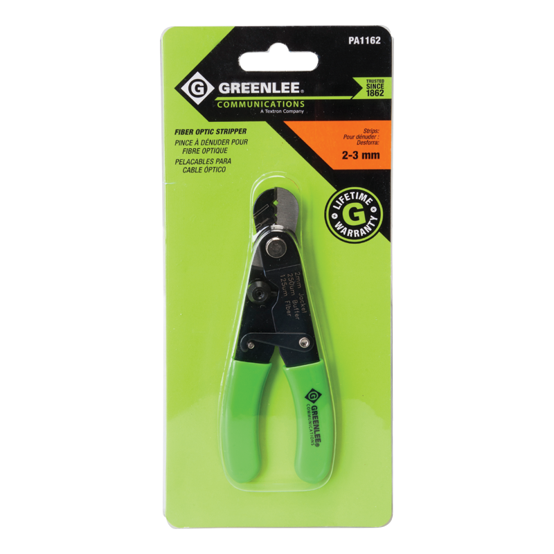 Greenlee Communcations PA1162, 3 seviyeli bir fiber optik sıyırıcıdır ( fiber optic stripper ). Bu sıyırıcı ile 2.0 mm ve 3.0 mm çapında dış kılıfa sahip fiber optik kabloları soyarak, ek ve sonlandırma için hazır duruma getirebilirsiniz. 2.0 mm, 250 μm ve 125 μm‘ye ayarlanmış 3 deliği ile hızlı bir şekilde fiber optik kabloyu sıyırmanıza imkan sağlar. Kullanılmadığı zaman güvenli bir şekilde muhafaza edilmesi için kilit mekanizması vardır.
